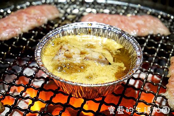 放上烤網的牛肉,油脂因為熱而流下,整個火勢變大,肉品烤得嗞嗞作響