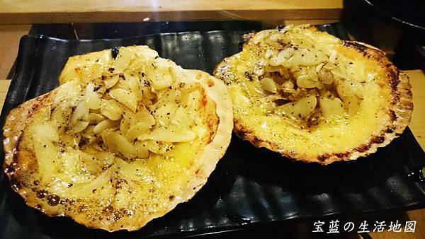 奶油蒜香扇貝超大的一顆扇貝,底部和奶油、一堆蒜片一起在烤爐上烤